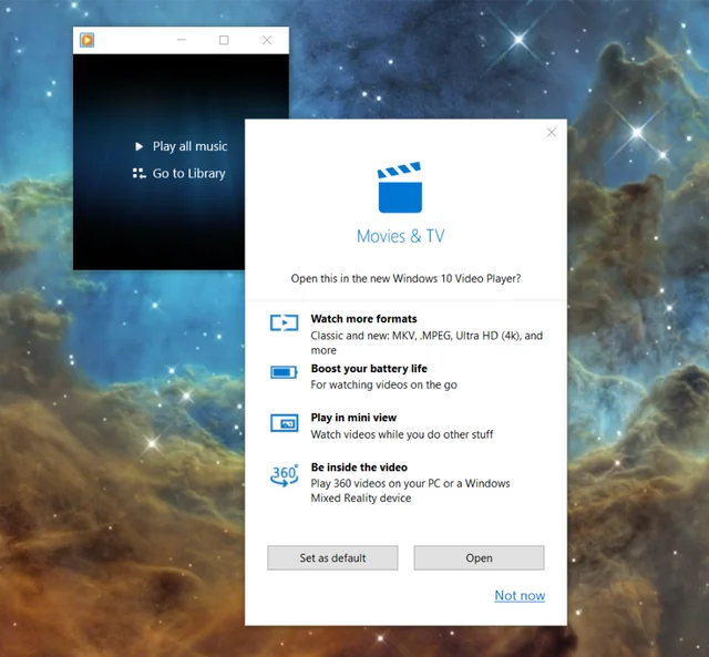 The popup message touts the Movie and TV app’s advantages, which includes better battery life if running on a phone or laptop, better compatibility with more modern video formats, a mini-view, and support for 360-degree video on Augmented Reality devices.
